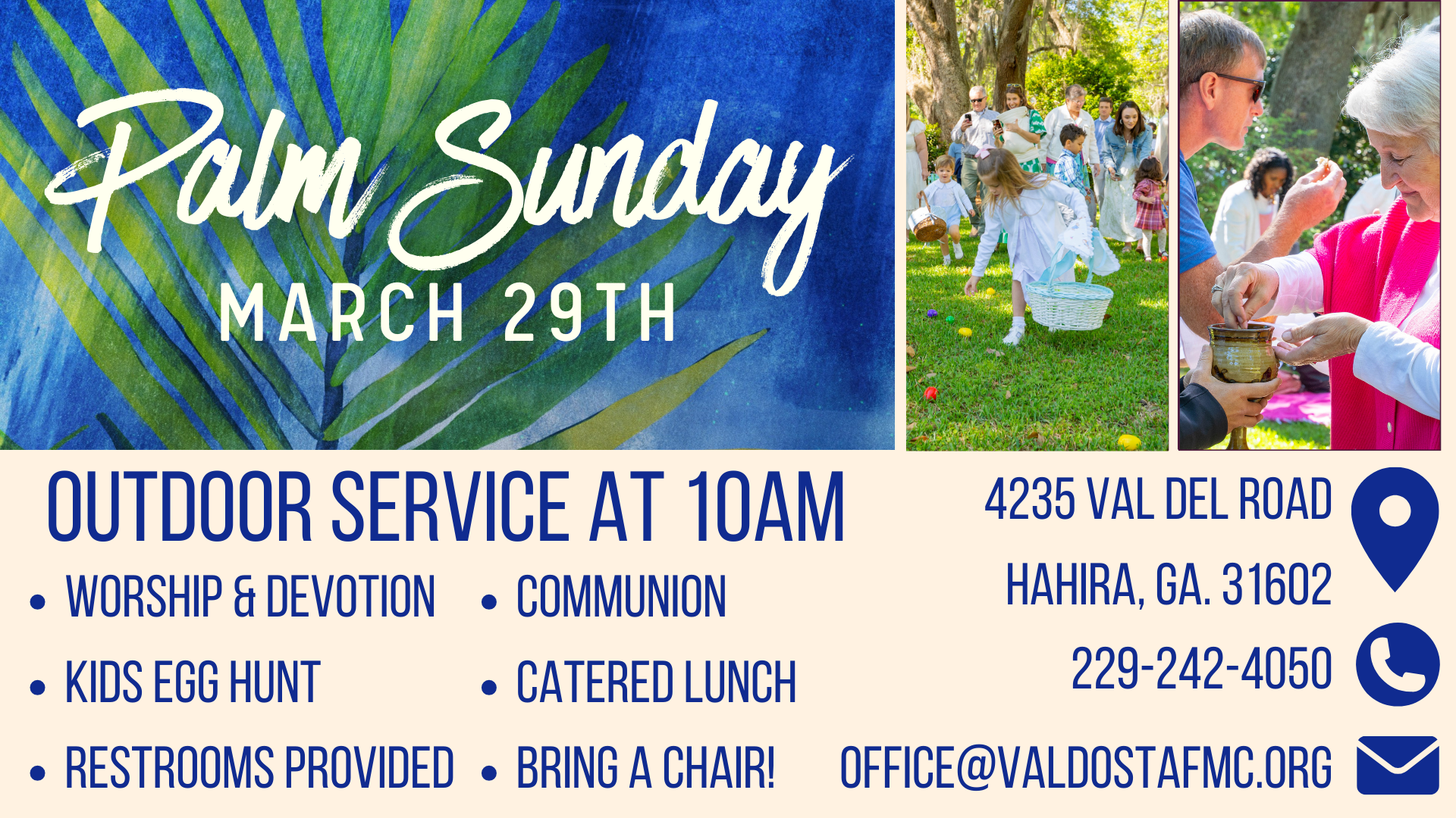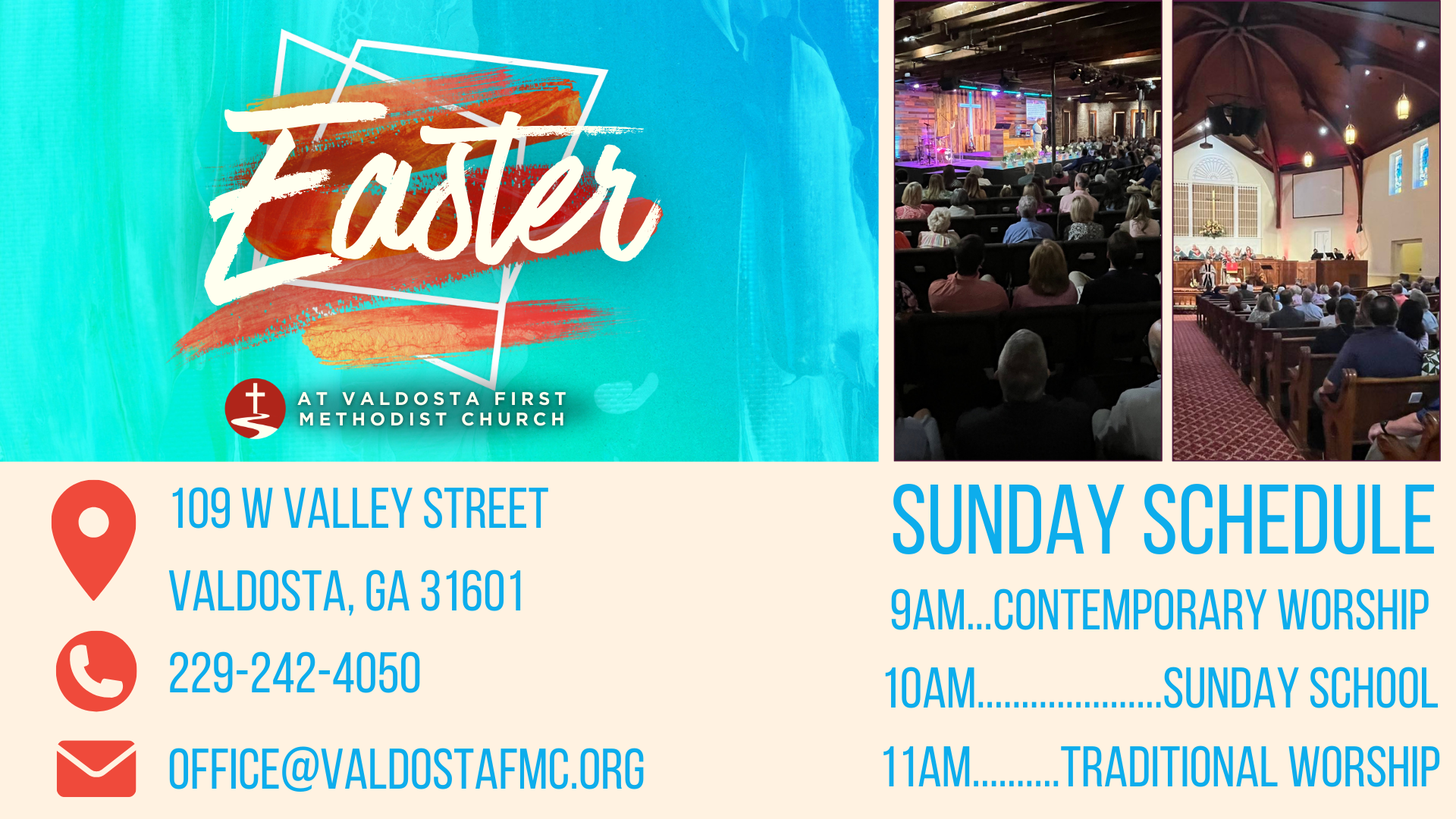 JOIN US FOR WORSHIP!9AM in The Loft | 11AM in the SanctuaryWatch LiveContact us Our Office Hours: Monday-Thursday: 8:00AM-4:30PM, Friday: 8:00AM-1:00PM Office Location109 W Valley Street, Valdosta, GA 31601 Phone Number229-242-4050 Send a Messageoffice@valdostafmc.org SOCIAL MEDIA FacebookInstagramVimeoEmail
